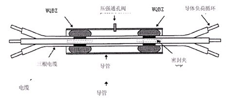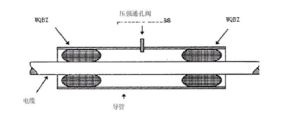 試驗設置:管道和電纜的類型和直徑按照安裝說明的要求選擇。電纜的長度根據所涉試驗實際情況進行選擇。對于壓力保持性試驗,WQBZ樣品充滿空氣,保持連接在穩(wěn)定的氣壓源上。在WQBZ區(qū)域,管壁有密封膠。如下圖所示: