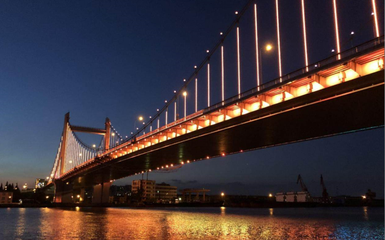 位于三江口下游跨越甬江的通途路慶豐橋,主橋為單跨地錨式懸索橋,引橋為雙幅預應力混凝土連續箱梁,橋梁結構全長734米,主橋面寬41米,引橋32.5米。橫跨奉化江,全長510米,兩邊引橋各長175米,雙向8車道。慶豐橋組合式索塔采用門式框架結構,弧形主纜使大跨徑一越而過,氣勢壯觀卻簡潔輕盈,極具城市門戶象征。