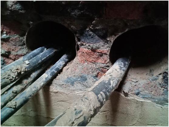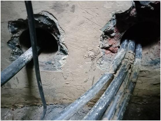 1)內徑φ150mm管孔8個(其中空管5個),管內電纜情況分為:一根直徑60mm左右粗的電纜孔1個;一根直徑60mm左右粗的電纜孔加3根小電纜孔一個;一根直徑30mm左右粗的電纜孔1個;