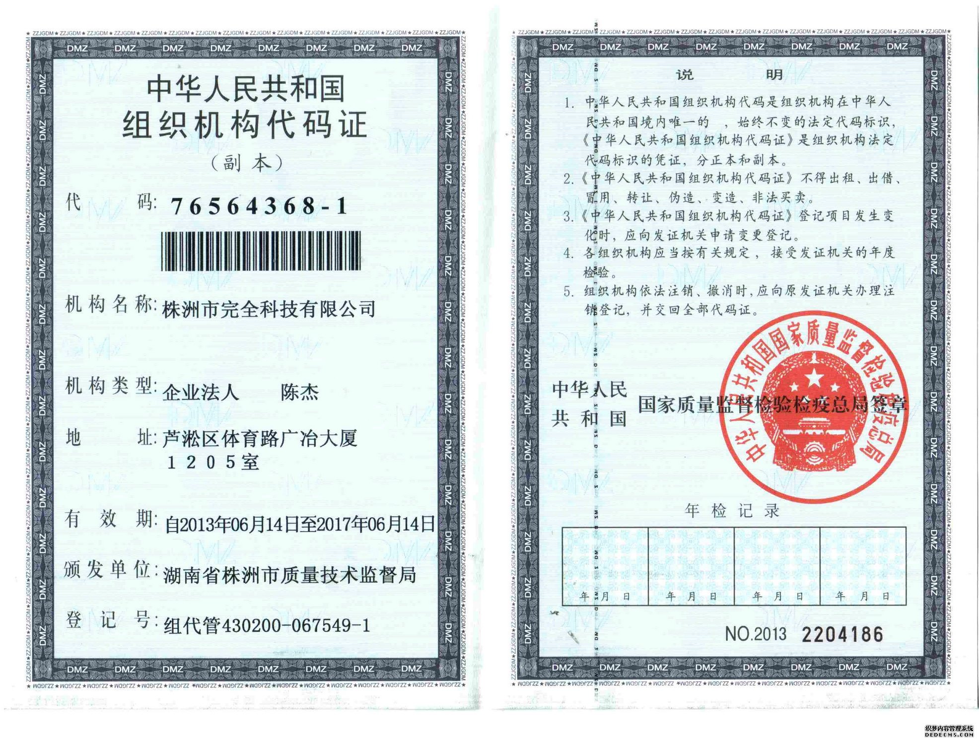 公司名稱變更之后的組織機構代碼證(變更日期:2013.06.14) 公司名稱變更之前的組織機構代碼證,點擊觀看大圖:
