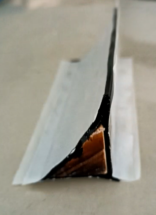 2、選擇合適規(guī)格的填充木條,在對(duì)木條三面貼膠處理后,對(duì)應(yīng)管孔內(nèi)四個(gè)直角貼緊固定。