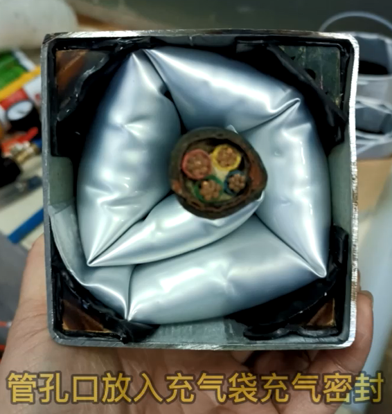 3、將充氣封堵產(chǎn)品圍繞電纜裝入方孔內(nèi),完成充氣過程,即完成封堵過程。