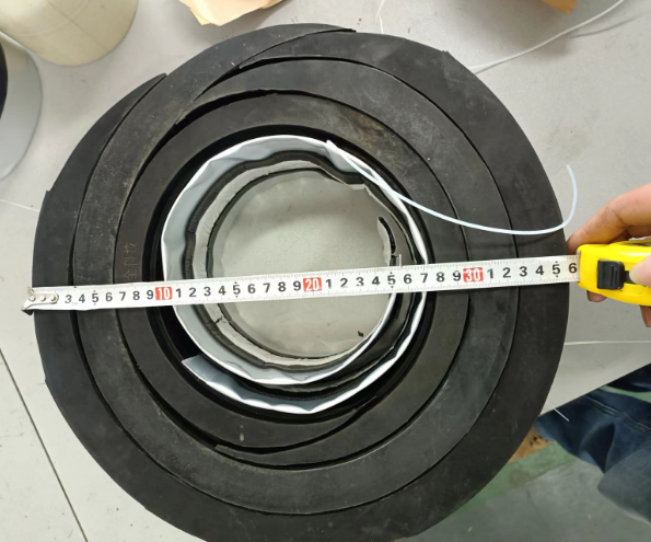 在電纜管孔或索導管孔防水封堵施工中,遇到超大管孔(內徑φ220-400mm)時,并且管孔的環形空隙寬度超過80mm(單邊寬度平均40mm),密封氣囊無法有效填充管孔空隙,這時候就要用到變徑橡膠圈(見下圖),利用多種規格變徑橡膠圈搭配組合來縮小電纜管孔的空隙寬度。