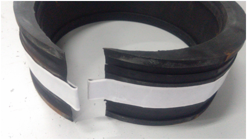 為保證變徑橡膠圈與管道內壁(又或是橡膠圈之間)的緊密貼合,需要先對變徑橡膠圈外側中縫的凹槽貼一條防水膠帶(見下圖)。